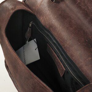 Circa 2006, this bag from Balenciaga is crafted in a distressed brown suede leather, and features silver-tone hardware, a structured top handle, a key clochette, and a face mirror. The front flap is secured by a pushlock, and opens to a black-canvas-lined interior containing one zip pocket.