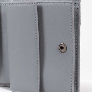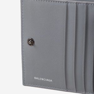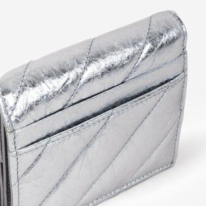 Crafted from metallized crushed calfskin leather in silver, this chic bifold wallet from Balenciaga flaunts a tonal ‘B’ emblem at the front, two slip pockets at the back, and a snap closure on the flap. Its interior is fully lined in grey leather and features tonal topstitching, a flap coin pocket, 4 card slots, and a long bill pocket.