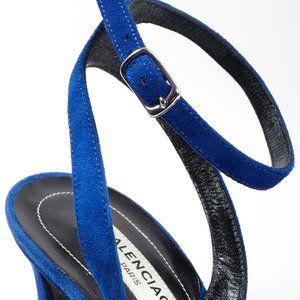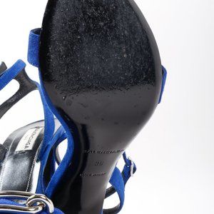 Made in Italy, these Balenciaga sandals flaunt electric-blue suede with black leather lining, ankle straps that close with silver clasps, and a classic silhouette with an almond toe. The stiletto heel shape complements the large, silver hardware at the front of the shoe to create a blend of chic, class, and bold.