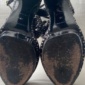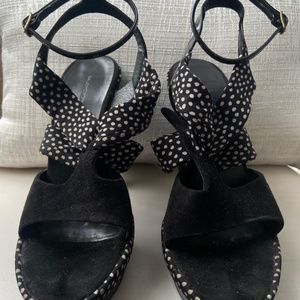 Black and cream canvas platform sandal heels with polka-dots throughout. Black suede trim and tonal black resin block heel and with buckle ankle strap. 5.75” heel. 100% authentic