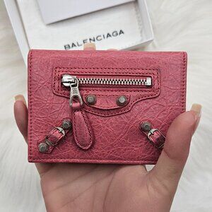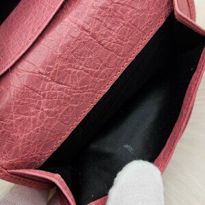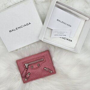 Elegant and compact card holder crafted in light pink leather, featuring gold-tone hardware.