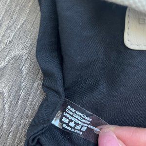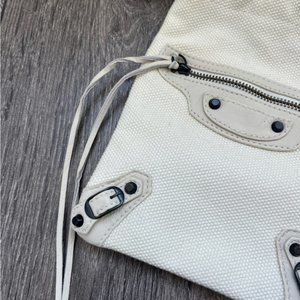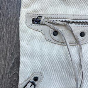 Ivory canvas Balenciaga Motocross cosmetic pouch with leather trim, single zip pocket at exterior front, black canvas lining and drawstring closures at top.