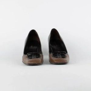 A classy pair of Balenciaga Patent Snake-Embossed Leather Bow Pumps to style with your evening attire. These pair of pumps come in glossy black patent leather, snake-embossed brown leather at fronts, square toes with square cutout at fronts, patent leather lace and bow accent at fronts, black leather lining with brown suede at the back, and leather insoles.