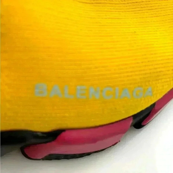 Bright yellow textile upper body with printed black Balenciaga logo on outer sides.