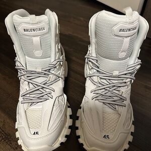 Introducing the ultimate fusion of luxury and athleticism: the Balenciaga Track Hike 'White'. These sneakers boast a bold silhouette with exaggerated rubber midsoles, providing both comfort and a statement-making aesthetic. The crisp white upper is crafted from supple leather, adorned with the iconic Balenciaga logo in contrasting black. Elevate your wardrobe with these versatile sneakers, perfect for both street style and hiking adventures.