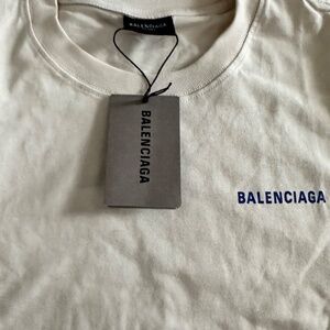 Balenciaga Unisex T-shirt size large, Cream coloured with blue lettering. tags still on it.