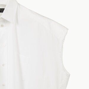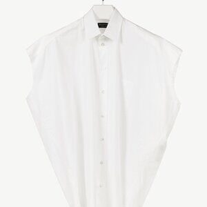 Made in Italy, this shirt from Balenciaga circa 2022 is crafted in a white cotton poplin, and features raw-cut armholes, drop shoulders, a collared neckline, front button closures, an oversized fit, a left chest patch pocket, and a rounded hem.