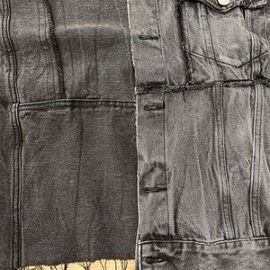 Two front chest pockets. Bottom half of jacket has a second layer with buttons + pockets (non functional pockets). Raw edge feature throughout garment.