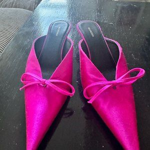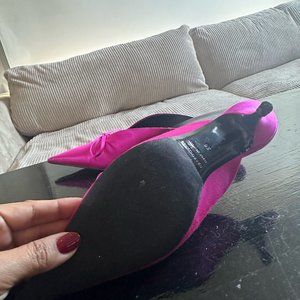 Balenciaga fuchsia satin Knife mule featuring an exaggerated pointed toe, V-shaped collar, tonal bow at collar, angled kitten heel and a black leather insole.