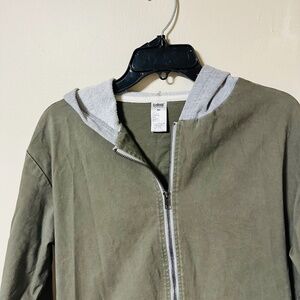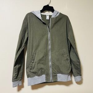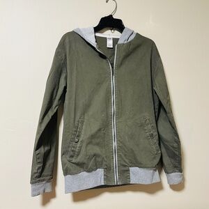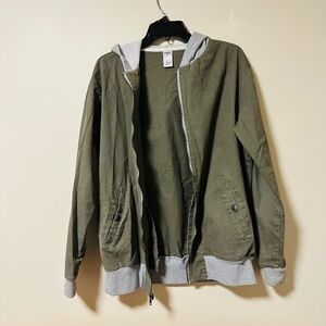 Olive Green Utility Jacket / Bomber Jacket with Gray Hood and Cuffs
