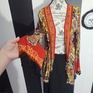 Vibrant cardigan with intricate patterns. Open front design. Perfect for layering.