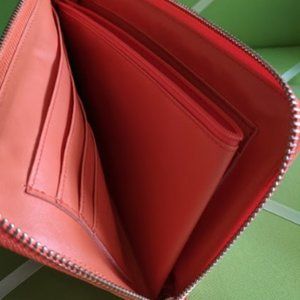Super adorable clutch for spring/summer or any time you'd like a punch of colour to accent your outfit, this modern, sleek clutch has a solid gold-coloured wrap-around zipper that contains 3 inside sections: a middle zip pocket and two sections with card slots (one with an extra drop pocket.) Water-resistant outer shell with criss-cross pattern. ballerina-jewelers.com - fine jewelers of the Caribbean!