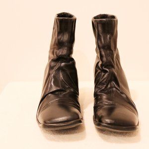 Black Bally ankle boots feature a square toe front, back zip closure. Great pre-owned condition. Minor normal wear and slight creasing on the leather.