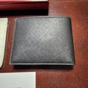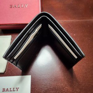 Bi-fold wallet from BALLY featuring black, leather, bi-fold design, internal logo stamp, card slots and silver-tone logo lettering.