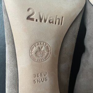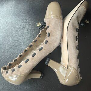 BRAND NEW Bally Elegant high heel pumps in Tan/Beige Made In Switzerland US 5.5 Eur 36. Elegant Bally high heel pumps in blue suede and patent leather cap toes and heels, with front bow and side lacing.
