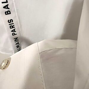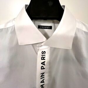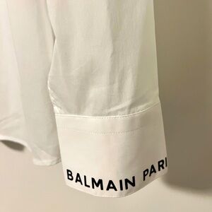 A pure cotton with Balmain Paris letters on button lines enhances this Balmain shirt. Crafted of cotton, this branded button-down style offers a comfortable and stylish look. * Spread collar * Long sleeves * Balmain on buttons * Button-front * 65% cotton 32% POLYM * Machine wash * Made in Italy SIZE & FIT Large Fits M and L depending on sort after style and look for this particular shirt. Length = 27 Sleeves = 31 Pit to pit = 22 This brand fits right. Style Code: 95BA9953-101 WHT
