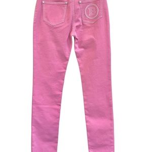 Barbie Pink medium-weight stretch denim high waisted skinny jeans with white top-stitching and B embroidered rear right pocket; silver Balmain engraved button & crest rivets on front and back pocket corners.