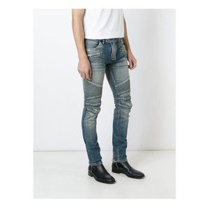 Blue cotton blend biker jeans from Balmain featuring a waistband with belt loops, a concealed front fastening, a five pocket design, front zipped pockets, ribbed details, distressed effects and a regular length.