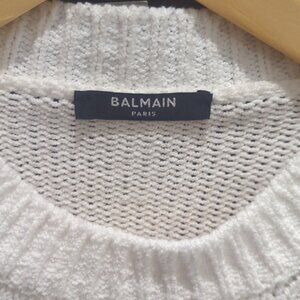 This is a gorgeous white Balmain sweater with 3 silver buttons at the shoulder, with black lettering at the chest. All hardware in prestine condition. Made in Italy. Worn once for a few hours for a fashion show. Bought for $1200.