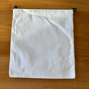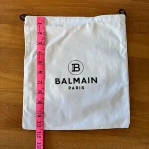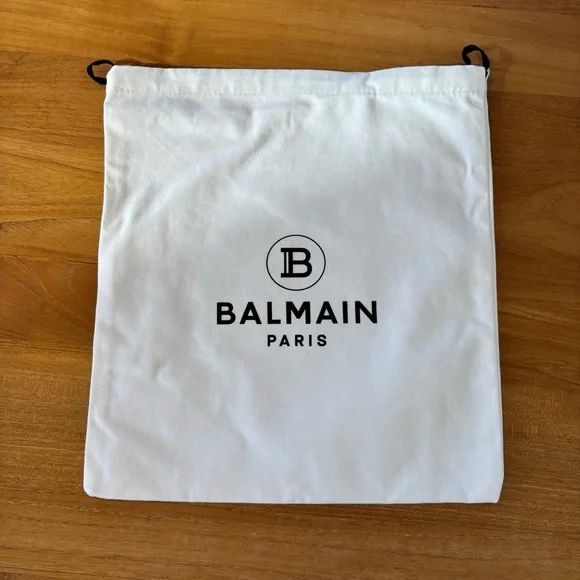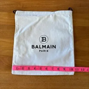 Sleek white drawstring bag with Balmain logo. Ideal for stylish storage.