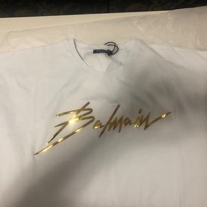 Balmain- White T-shirt with signature logo in gold