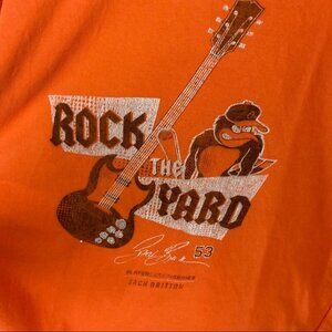 Baltimore Orioles Zach Britton 53 Orange Short Sleeve Tee in Size Medium. Player design series. Made in Bangladesh. Crew neckline. Bright orange colour. For Those About to Rock AC/DC theme for his entrance song. The Oriole Bird logo graphic holds a guitar and below is Zach's signature. 100% cotton. Machine washable. Very good pre-loved condition. No visible flaws.