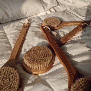 These are custom made dry brushes I had made for my online shop, I have since closed it but have a few left. They are all natural, long-handled bamboo and boar bristle brushes. Supports soft, glowing skin and lymphatic drainage. Each brush is unique in colouring.