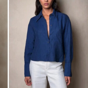 Traditional with a contemporary twist, this lightweight and natural linen fiber shirt has all of the beautiful details you love about a button-down, with a modern cropped length. Vented sides and a breezy silhouette make it a perfect choice for warm weather.