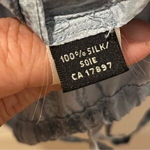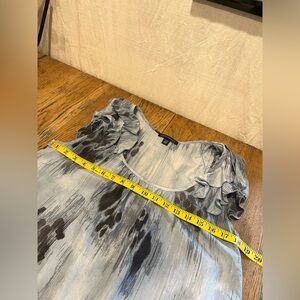 Light and luxurious Banana Republic top made of 100% silk. Features a grey-blue abstract print with dark accents, delicate ruffled sleeves, and an adjustable drawstring at the hem. Lightweight and elegant. No stretch.