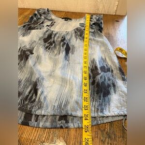 Haut sans manches léger et raffiné de Banana Republic, confectionné en 100 % soie. Motif abstrait bleu-gris avec accents foncés, volants délicats aux épaules et cordon ajustable au bas. Élégant et fluide. Non extensible.
