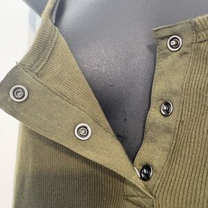 details: army green, ribbed, cotton + elastane blend, snap button closure neckline