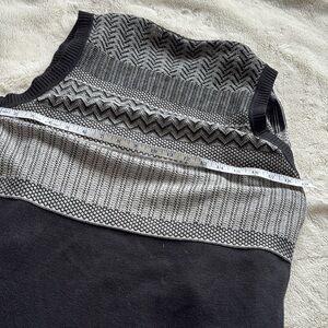 Elevate your layering game with this stylish sleeveless open-front cardigan in a versatile black and gray color palette. Featuring an eye-catching textured knit design with geometric chevron patterns, this piece blends comfort with a modern, artsy vibe. The asymmetrical hemline and lightweight soft knit fabric make it perfect for transitional seasons or indoor layering. A must-have for chic, effortless style.