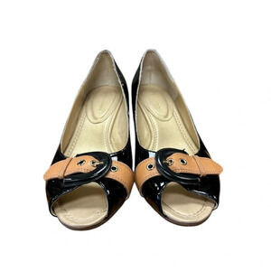 Peep toe. Buckle design. Black leather wedge with a cute tan colour strap with buckle