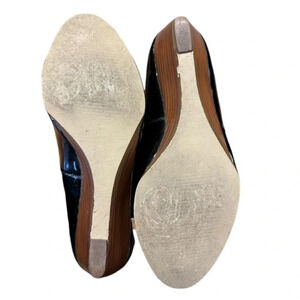 Banana Republic Black Leather Buckle Peep Toe Wedge Heels Size 7.5
