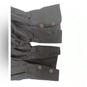 All black and 100% cotton this adorable blouse is peasant style with puffed sleeves. The round collar goes into a V neck. The cuffs are wide and each have two buttons. Pull over style