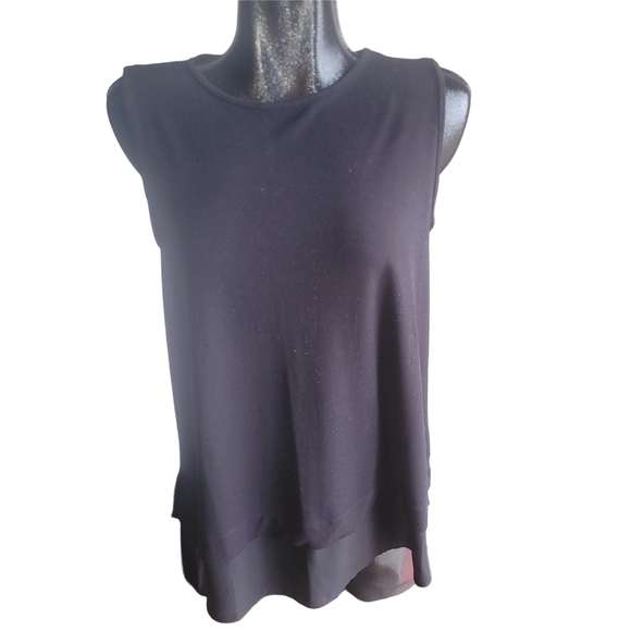 Banana Republic black sleeveless top with faux shirt overhang at hemline. Has an opening at back of neck.