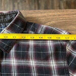 Casual button-down shirt with a plaid pattern. Features a chest pocket and long sleeves. Ideal for everyday wear. *Button chipped but has extra buttons