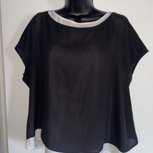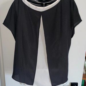 Black loose shirt with open back; white shirt attached under to create the double layer.