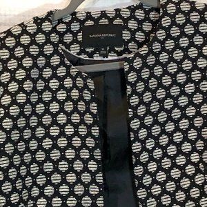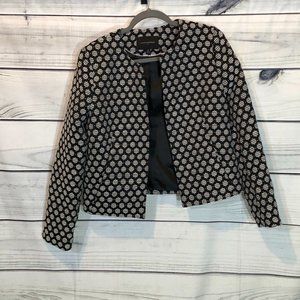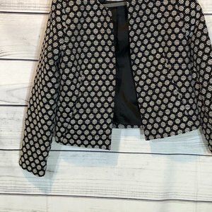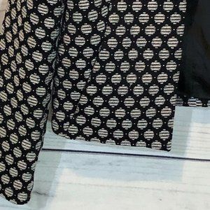 Chic open-front blazer. Black and white geometric pattern. Perfect for professional or casual wear.