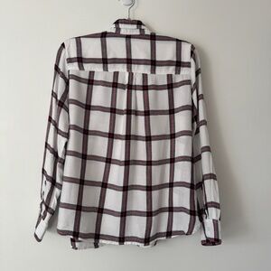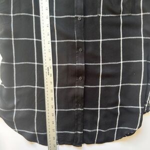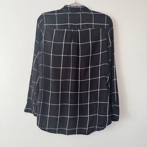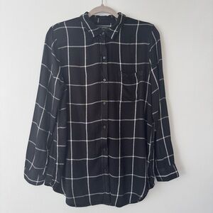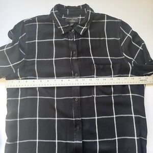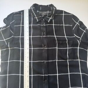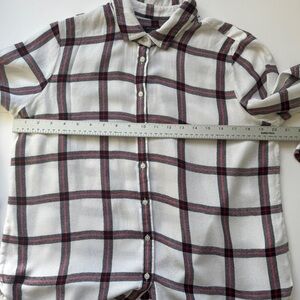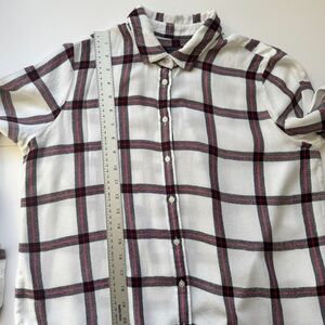 Stylish plaid blouses. One in black with white stripes. One in white with red and black stripes. Perfect for casual wear.