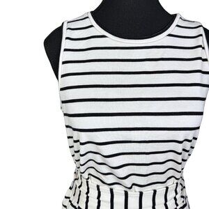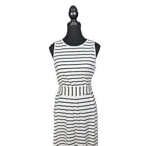 This Banana Republic midi dress is the perfect blend of timeless style and comfort. It features a classic black-and-white stripe pattern, a sleeveless scoop neckline, and a flattering tie waist that can be adjusted for the perfect fit. Made from a luxuriously soft and stretchy knit fabric, it drapes beautifully on the body and moves with you. The side slit adds a touch of sophistication while keeping it easy to walk in.