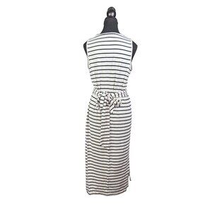This Banana Republic midi dress is the perfect blend of timeless style and comfort. It features a classic black-and-white stripe pattern, a sleeveless scoop neckline, and a flattering tie waist that can be adjusted for the perfect fit. Made from a luxuriously soft and stretchy knit fabric, it drapes beautifully on the body and moves with you. The side slit adds a touch of sophistication while keeping it easy to walk in.