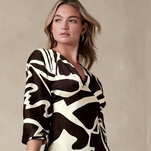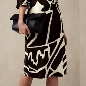 Banana Republic Blouson-Sleeve Satin-Shine Midi Dress in B&W Stonewash, Size 14