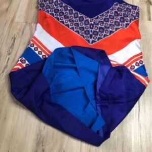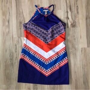 This stunning sundress from Banana Republic features a vibrant blue base with a striking red and white chevron pattern. Designed for casual and resort wear, it boasts a sleeveless halter neckline and a flattering mini length, perfect for warm weather outings.