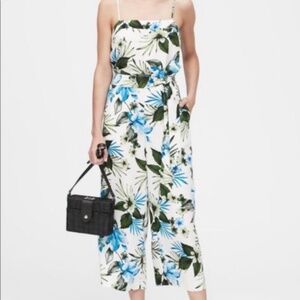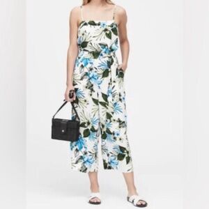 Chic floral jumpsuit with vibrant blue and green design. Perfect for stylish outings.