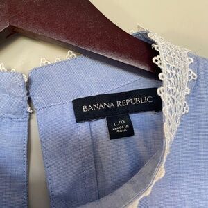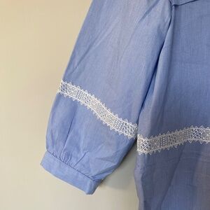 Elegant blue blouse with white lace detailing. Features a high neckline and three-quarter sleeves. Perfect for a chic, sophisticated look.