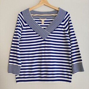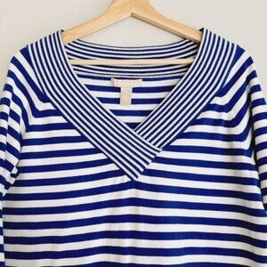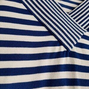 Stylish V-neck sweater with bold blue and white stripes. Perfect for casual wear. Comfortable and chic design.
