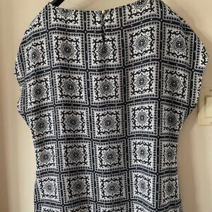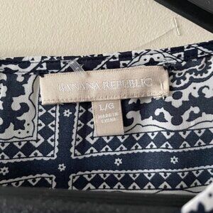Banana Republic Blue/White Squares Sleeveless Blouse Size L - blue and white squares, 100% polyester, , one button back, bit of a flair to the bottom - generously covers any “flaws” – light weight – boat neckline , measurements from under the arms , 21” across chest, 14.5 “ under the arms to the bottom of the blouse , shoulder seam is 7.5” wide, back length from neck to hemline is 26” - smoke/pet free home