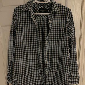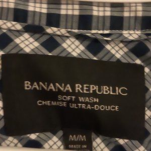 Black and white plaid, button-down, long sleeve shirt with collar by Banana Republic.