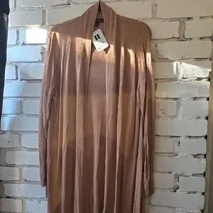 Banana Republic long open-front cardigan in camel. Soft knit fabric with draped collar. Classic, versatile layering piece.